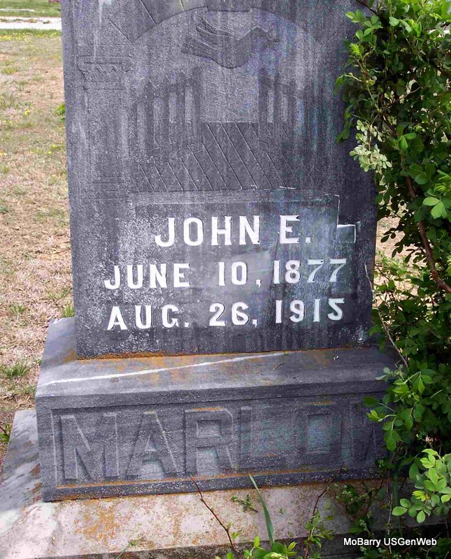 Research Note: He was the son of Amos Marlow and Laura Ann Blanchard. - 1880 Census,Census, Oxford, Jones, Iowa - John, age 3 is with his parents Amos and Laura and siblings. - In the 1900 Census the family is in Ashton, Sherman, Nebraska. - 1910 Census, they are in Garretson Ward 2, Minnehaha, South Dakota. - John's siblings were Elsie, George, Arthur, Walter, Herman, and Ida. - August 26, 1915, Cassville Republican, Barry Co., MO - Butterfield News: Jno. Marlow who lives in the Gunter district is seriously ill with typhoid fever. - September 9, 1915, Cassville Republican, Barry Co., MO - Butterfield News: A Mr. Marlow of South Dakota is here looking after the estate of his brother, John Marlow, dec'd. He will take the three younger children with him but we understand the oldest girl, Minnie, will remain with Dr. Chandler's of Cassville. - John E. Marlow, age 37, married Mrs. Nelsie (Hilburn) Sooter, age 20, on Dec. 14, 1914 in Barry Co., MO. | Online Newspapers MO Marriage Records Census Phyllis Long Photo Diana Cope |