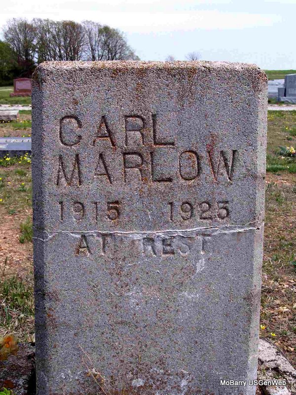 Research Note: Given name on death certificate was Richard Carl. He was the son of John Marlow and mother's maiden name was Hilburn. Artie Stella Bacon of Washburn, MO was the informant on the death certificate. Note: His mother was Nelsie Hilburn. - The Cassville Democrat, August 8, 1925 - We are sorry to learn of the death of little Carl Marlow, son of John Marlow, deceased, and wife. He contracted blood poisoning two weeks ago and in spite of all that medical aid and loving friend and relatives could do he passed away to be with the redeemed. Carl was nine years old and was well loved by all who knew him. He was laid to rest by his father's side in the New Church cemetery. Rev. J.T. Brattin delivered the funeral sermon. | Online Newspapers Death Certificate Phyllis Long Photo Diana Cope |