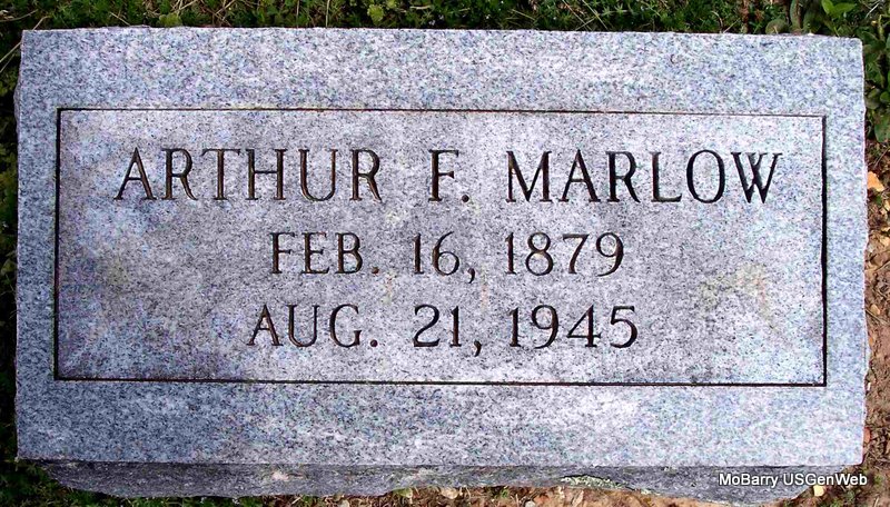 Research Note: He was the son of Amos Marlow born IL and mother not named. He was married and Mrs. Nelcie Marlow of Exeter, MO was the informant on the death certificate. - His mother was Laura Ann Blanchard. Nelsie Hilburn married first, Mr. Sooter, second John E. Marlow on Dec. 14, 1914, third Arthur F. Marlow in Dec. 1916 and fourth Mr. England. She is buried in Mt. Pleasant cemetery under the England name. - 1880 Census,Census, Oxford, Jones, Iowa - Arthur, age 1 is with his parents Amos and Laura and siblings. - In the 1900 Census the family is in Ashton, Sherman, Nebraska. - 1910 Census, they are in Garretson Ward 2, Minnehaha, South Dakota. - 1930 Census, Missouri, Barry, Flat Creek: Arthur F. Marlow, head, age 51, age at first marriage 38, born IA, parents born IL, Nelsie, wife, age 35, age at first marriage 18, born MO, parents born AR. - Dec. 28, 1916, Cassville Republican, Barry Co., MO - Licenses to Wed: A. F. Marlow, 38, Garretson, S. D. and Nelsie Marlow, 22, Cassville. - December 28, 1916, Thursday, Cassville Republican - On Christmas day Mrs. Nelsle Marlow and Arthur F. Marlow of Garreston, S. D., were married at the home of the bride's father, Thomas Hilburn at near Butterfield, Eld. J. T. Brattin officiating. After the ceremony a bountiful dinner was enjoyed by all present. - Arthur's siblings were Elsie, George, John, Walter, Herman, and Ida. | Census MO Marriage Records Death Certificate Online Newspapers Phyllis Long Photo Diana Cope |