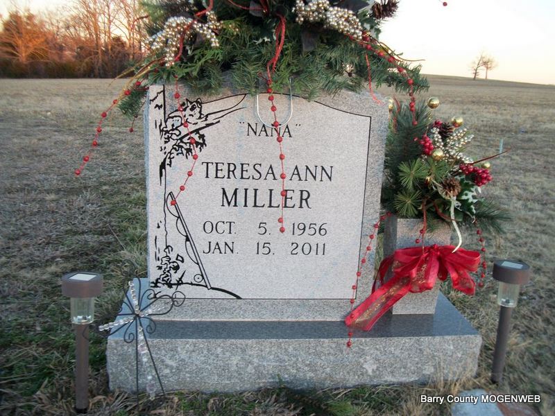 Research Note: She was the daughter of R. B. and Wanda (Boman) Smith. She married Jerry Miller on May 5, 2003 in Eureka Springs, Arkansas. He preceded her in death on November 22, 2005. She and her two sisters "The Smith Girls" owned and operated numerous restaurants in southwest Missouri, including The Wagon Wheel in Diamond, The Duck Inn and the Lindenwood Hotel in Purdy, the Donut Shop in Cassville, The Whistle Stop and the Sale Barn Cafe in Exeter, and the Over the Hill Grill at the Cassville Golf Club. Teresa was employed at the Roaring River Clinic in Cassville before becoming manager of Peachwood Manor where she has been for the past six years. - Jerry Miller is buried at Corinth Cemetery. His obit states that he married Teresa Walker on May 5, 2003, in Eureka Springs, AR. Survived by a stepson with the surname Walker. | Fohn Funeral Home Phyllis Long Photo Diana Cope |