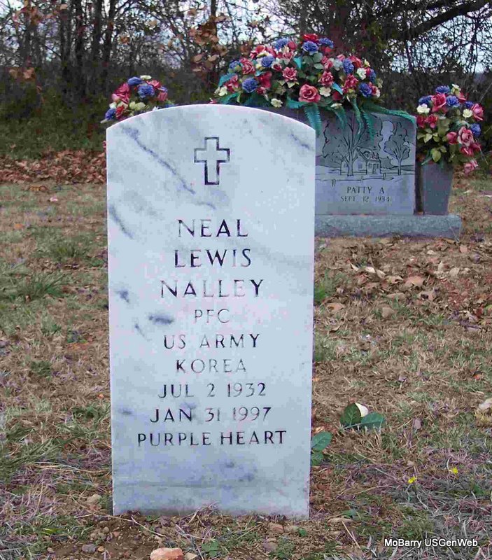SSW: Patty A. - Research Note: Son of Marvin G. Nalley and Opal Fern Ledford. Neal was an Army veteran, enlisted on Dec. 5, 1952 and released Sept. 21, 1954. SSN was issued in KS. - Another Photo - Military Stone - Inscription: "PFC US ARMY KOREA - PURPLE HEART" - Another Photo | SSDI SS Claims Index TX Death Index Veterans Death File Phyllis Long Photos Diana Cope Photo Jay Trace |