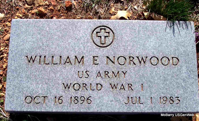 SSW: F. Velma - Research Note: He was the son of Marion Woodbury Norwood and Naomi Jane Conley. His wife was Frenty Velma Riley. WWI Draft Reg. places him in Red River Co., TX. - Military Stone - Inscription: "US ARMY WORLD WAR I" | WWI Draft Reg. Census Phyllis Long Photo Diana Cope |