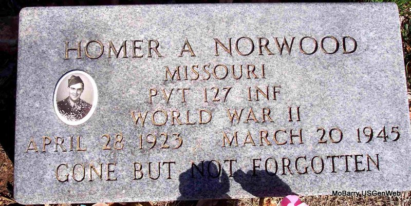 Inscription: "MISSOURI PVT 127 INF WORLD WAR II" - Research Note: Son of William Ernest and Velma (Riley) Norwood. His wife was Beulah. - Cassville Republican Sept. 20, 1945 - Awarded Posthumously By Officer To Young Northwood’s Wife Camp Crowder, Mo., Sept. 17- For meritorious achievement that cost him his life, the Bronze Star Medal has been posthumously awarded to Infantryman Pvt. Homer A. Norwood of Cassville, Missouri. Presentation of the award was made to his wife, Mrs. Beula M. Norwood, Cassville, Mo., by the Commanding General of Camp Crowder, by direction of the President of the United States. The citation read: For meritorious achievement in connection with military operations against the enemy near Santa Maria, Lulon, Philippine Islands, on 23 and 24 February 1945. Pvt. Norwood was a member of a platoon which was given the mission of capturing a steep hill where the enemy, armed with machine guns, grenades, mortars, and small arms, was dug-in holes from four to six feet deep. Though the enemy outnumbered them and had the advantage of both position and fire power, Pvt. Norwood and his fellow soldiers attacked. For six hours, under the most trying conditions of weather and terrain, they battled a determined and fanatical enemy, fighting forward inch by inch, until every single one of the defenders was killed. During the night and early morning of the following day our men repulsed a counter-attack, killing and wounding many more of the enemy. The heroic action of Pvt. Norwood and his fellow soldiers in completely and halting the foe and capturing a vital position in the face of heavy odds reflects high credit on him, his comrades, and the Armed Forces of the United States. |