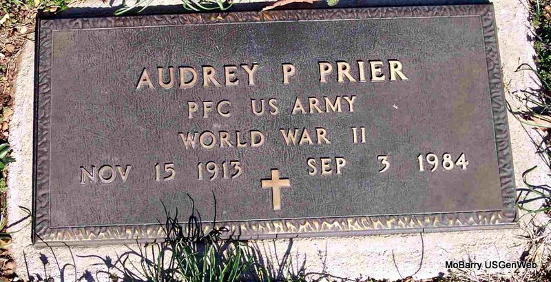 | PRIER, Audrey Paul | Nov. 15, 1913 | Sept. 3, 1984 | Inscription: "PFC US ARMY WORLD WAR II" - Research Note: He was the son of Adam Franklin Prier and Myrtle Adams. Audrey Prier, age 25, of Purdy, Barry Co., MO, married Frances Pennel, age 27, of Purdy, Barry Co., MO on Dec. 1, 1938 in Benton Co., AR. | Census AR Marriage Records Phyllis Long Photo Diana Cope |