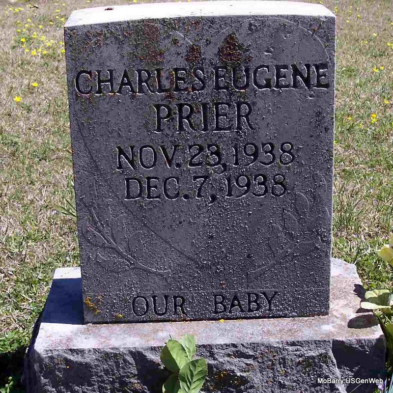 | PRIER, Charles Eugene | Nov. 23, 1938 | Dec. 7, 1938 | Inscription: "Our Baby" - Research Note: He was the son of Hershel H. Prier and Evelyn Louise Richardson. | Note Phyllis Long Photo Diana Cope |
