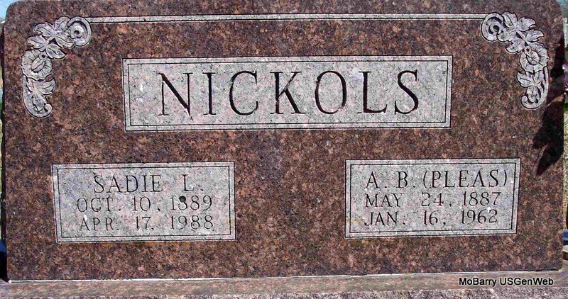 SSW: Sadie - A. B. married Sadie Hooten on July 5, 1907 in Cassville, Barry Co., MO. He was the son of James Nickols and Mary Elizabeth White. | Death Certificate MO Marriage Records Census WWI Draft Reg. Phyllis Long Photo Diana Cope |
