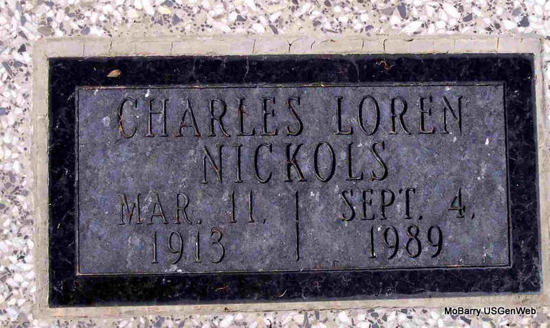 | NICKOLS, Charles Loren | Mar 11, 1913 | Sept. 4, 1989 | Research Note: He was the son of Amos B. Nickols and Sadie Hooten. His wife was Blanche Still. | Census Phyllis Long Photo Diana Cope |