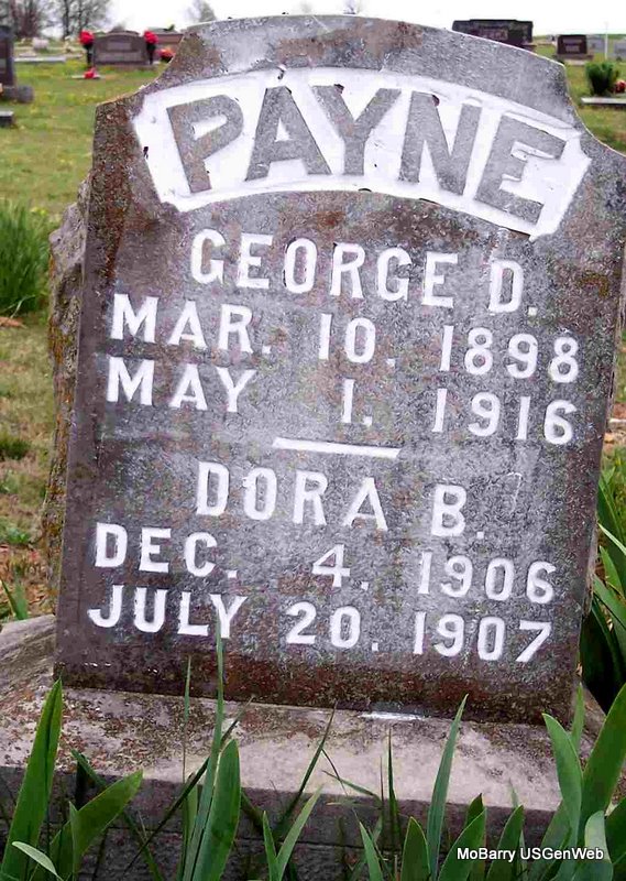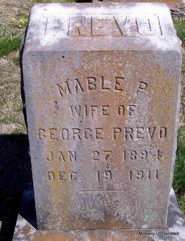 Inscription: "Wife of George" - Research Note: Her death certificate gives her birth date as Sept. 16, 1885. Age 26 years, 3 months which would make the birth year 1885. Stone has Jan. 27, 1894. Death date is Dec. 17, 1911. She was married and the daughter of A. F. Hilker born KY and E. M. Klotter born Dayton, OH. She died in child birth. - Cassville Republican, Dec. 28, 1911 - Clark News: Died at her residence 4 miles south of Monett, Mrs. Mabel Prevo, on Dec. 19, 1911, age 17 years, 10 months and 21 days. Was married to George Prevo, April 26, 1911. Mabel was the daughter of Judge Hilker near Corsicana and an excellent woman. She was converted at the age of 13 years and lived a constant Christian life and will be greatly missed by her relatives and friends. Her remains were laid to rest here in the Mt. Pleasant Cemetery after funeral services by Rev. Combs. She leaves a husband father and mother, 2 brothers and 4 sisters to mourn their loss. | Death Certificate Online Obit Phyllis Long Photo Diana Cope |