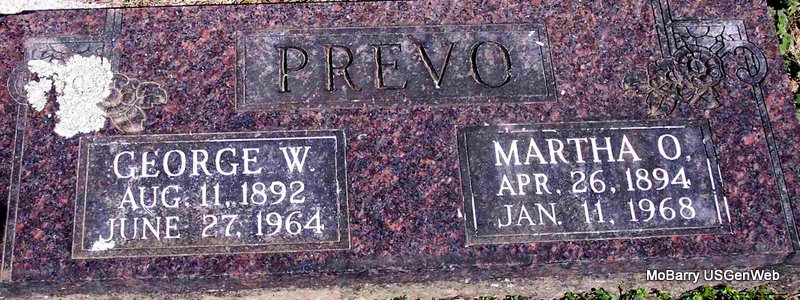 SSW: Martha O. - Research Note: He was the son of Manford C. Prevo and Margaret Davis. His first wife was Mable Hilker. Second wife was Martha O. Rehwinkle. Martha was the informant on the death certificate. - May 19, 1917, Cassville Democrat, Barry Co., MO - Marriage License: Geo. W. Prevo and Martha Rehwinkel, Purdy. - Monett, MO: Services will be held at 3 o'clock this afternoon at Bennett and Wormington chapel for George Prevo, 71 years old who died Saturday night at his residence in Purdy. Burial will be in Mt. Pleasant cemetery. | Census Online Newspapers Obit Death Certificate Phyllis Long Photo Diana Cope |