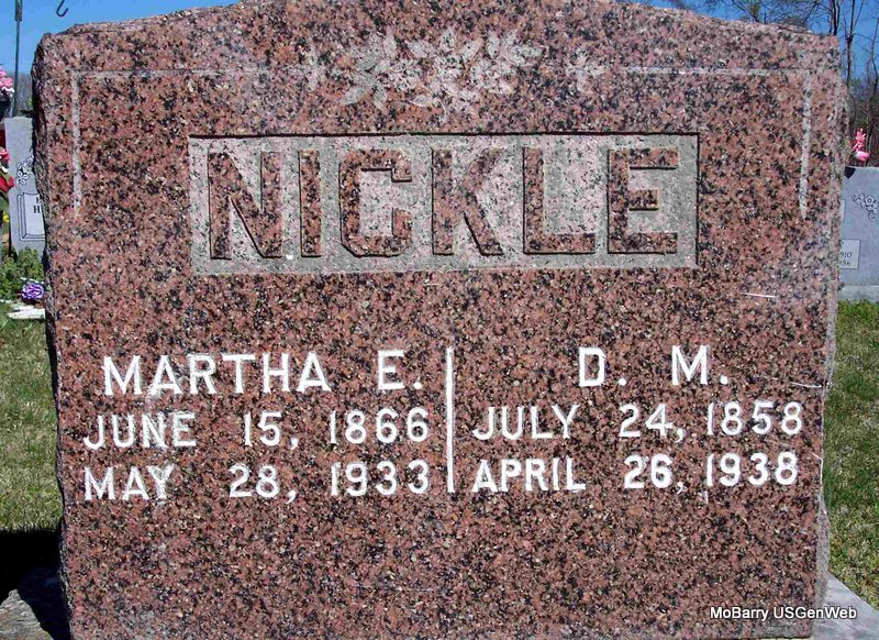 SSW: Martha Ellen - Research Note: Daniel M. Nickle married Ella Burchett on Feb. 8, 1885 in Barry Co., MO. He was the son of Henry R. Wilson Nickle and Esther Brown. - Cassville Republican, Thursday, February 27, 1919 - Mr. and Mrs. D. M. Nickle of Butterfield attended the funeral of their niece, Mrs. F. W. Bennington, Sunday. - Nickle Family Photo - Photo of Daniel's Parents | Census MO Marriage Records Online Newspapers Phyllis Long Photo Diana Cope |