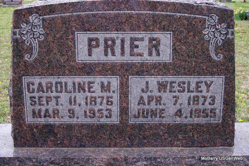 SSW: Caroline M. - Research Note: His wife was Caroline Minerva (Riddle) Prier. Son of George Prier and Mary Jane Freeze. Oscar Prier of Purdy, MO was the informant on the death certificate. - May 30, 1912, Thursday, Cassville Republican - Munsey News: J. W. Prier was in this part a few days ago after berry pickers. - December 7, 1916, Thursday, Cassville Republican - J. W. Prier appointed judge of election for McDonald township No. 2 instead of Jas. McIntosh who lived in McDonald No. 1. - February 21, 1918, Thursday, Cassville Republican - Leonard and John Prier made a trip to Gunter one day last week to take their grandmother to that place. | Death Certificate Online Newspapers Phyllis Long Photo Diana Cope |