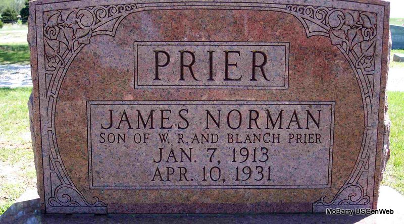 Inscription: "Son of W. R. and Blanch Prier" - Research Note: He was the son of William Roland Prier and Blanch Ella Mackey both born Butterfield, MO. Cause of death was influenza. Thurman A. Prier of Butterfield, MO was the informant on the death certificate. | Death Certificate Phyllis Long Photo Diana Cope |