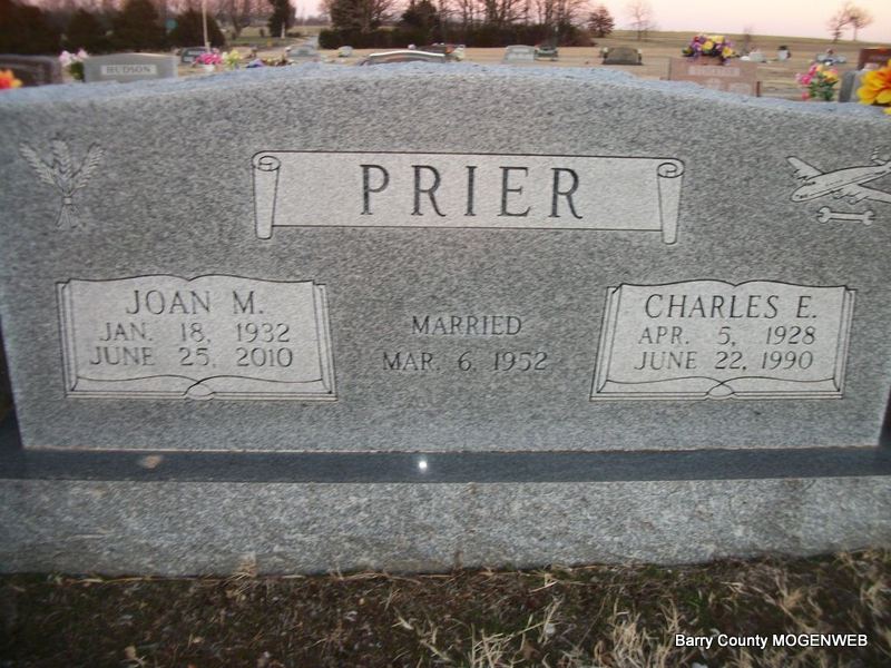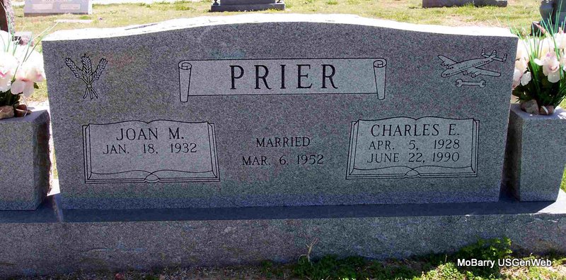 | PRIER, Charles Edward | Apr. 5, 1928 | June 22, 1990 | SSW: Joan M. - Inscription: "Married Mar. 6, 1952" - Research Note: He was the son of Thurman Andrew Prier and Ruby Mae Shoopman. - Another Photo | Census Phyllis Long Photos Diana Cope |