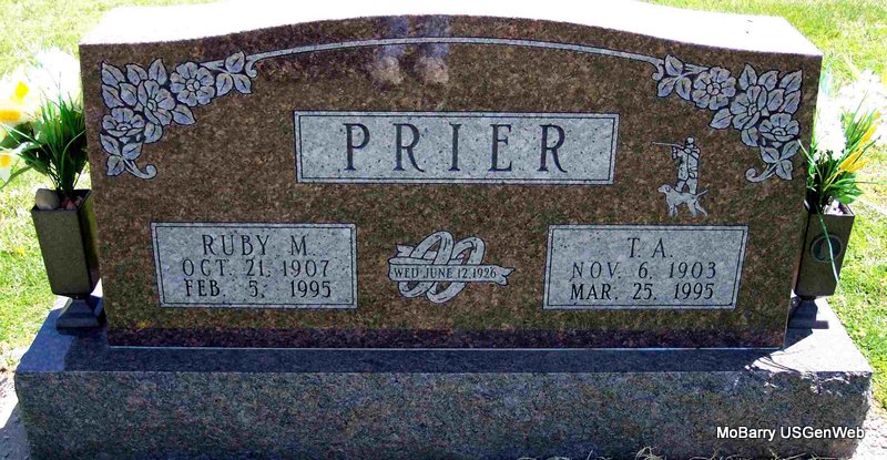 | PRIER, Thurman Andrew | Nov. 6, 1903 | Mar. 25, 1995 | SSW: Ruby M. - Inscription: "Married June 12, 1926" - Research Note: He was the son of William R. Prier and Blanch Ella Mackey. | Census Phyllis Long Photo Diana Cope |