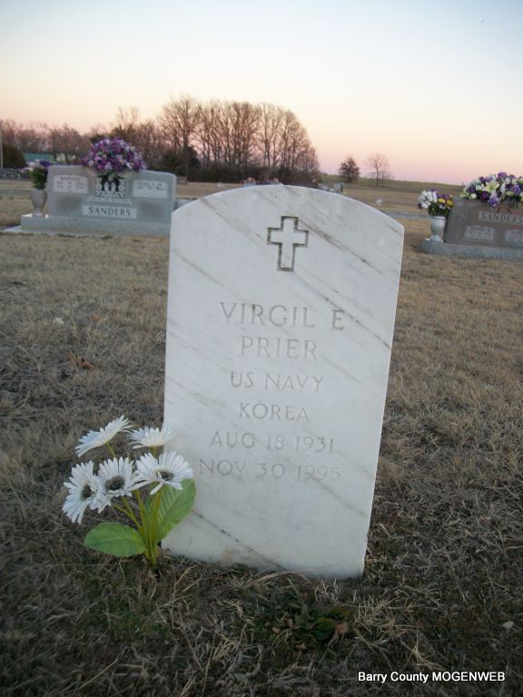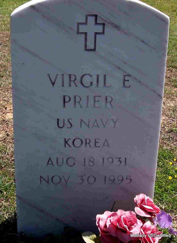 | PRIER, Virgil Eugene | Aug. 18, 1931 | Nov. 30, 1995 | Inscription: "US NAVY KOREA" - Research Note: He was the son of Oscar C. Prier and Rilla (Andrews) Prier. His wife was Judy. - Another Photo | Brother's Obit Census Phyllis Long Photos Diana Cope |