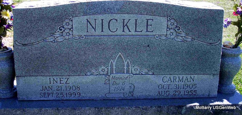 SSW: Inez - Inscription: "Married Dec. 26, 1924" - Research Note: On his death certificate he is listed as a son of Daniel M. Nickle and Martha E. Burchett. Inez was given as his wife's name. His wife was Jewel Inez Prier. - January 13, 1906, Cassville Democrat - Butterfield News: D. M. Nickle and family visited James Nickle and family, Sunday. | Death Certificate Donna Cooper Online Newspapers Phyllis Long Photo Diana Cope |