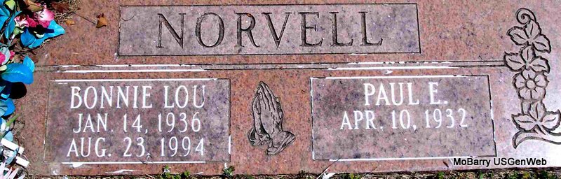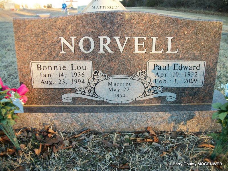 SSW: Bonnie Lou - Inscription: "Married May 22, 1954" - Research Note: He was the oldest son of the late Glen and Indianola (McCracken) Norvell. He was united in marriage to Bonnie Lansdown on May 22, 1954, and she preceded him in death Aug. 23, 1994. Paul served his country in the Korean War. Paul was preceded in death by his parents, wife, one brother Clifford, and one sister Christina. - Another Photo | Monett Times Jay Trace Photos Diana Cope |