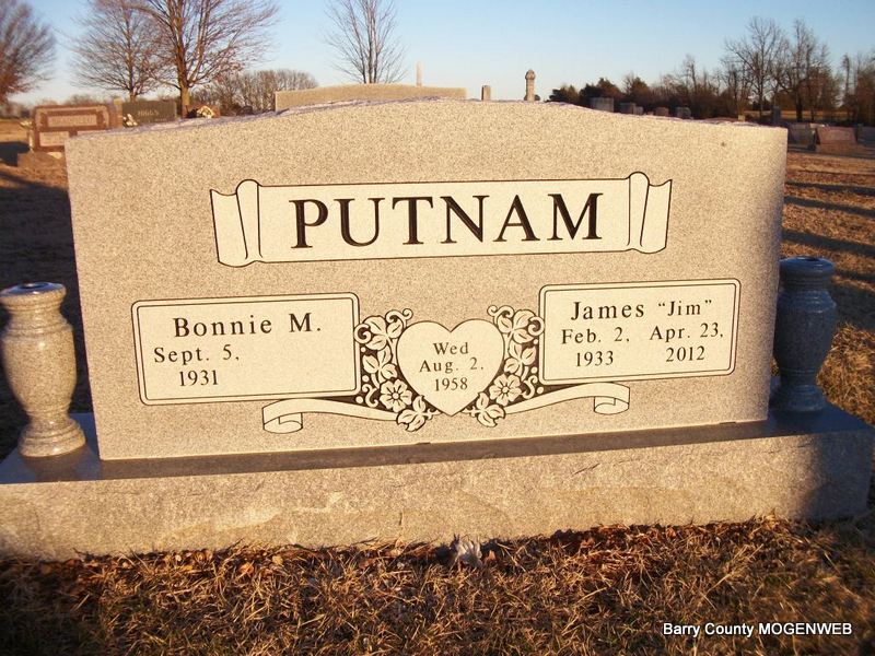 SSW: Bonnie M. - Inscription: "Aug. 2, 1958" - Research Note: James "Jim" Putnam, 79 of Joplin, Missouri passed away Monday April 23, 2012 from a lengthy illness. He was a beloved and caring husband, father, and grandfather. He was a humble hero to many. Jim was born February 2, 1933 in Washburn, Missouri to James and Olive (Penniston) Putnam. He was employed by Eagle Picher Manufacturing and retired in 1996. Jim had lived in the Joplin area for the past 50 years and was a member of Harmony Heights Baptist Church, where served as a deacon. He was a member of Gideon’s International. Jim married Bonnie Higgs on August 2, 1958 in Wheaton, Missouri, who survives. He was preceded in death by 3 sisters Marjorie Banks, Evelyn Gavisk and Dorothy Putnam. | Photo Diana Cope Note Donna Cooper |