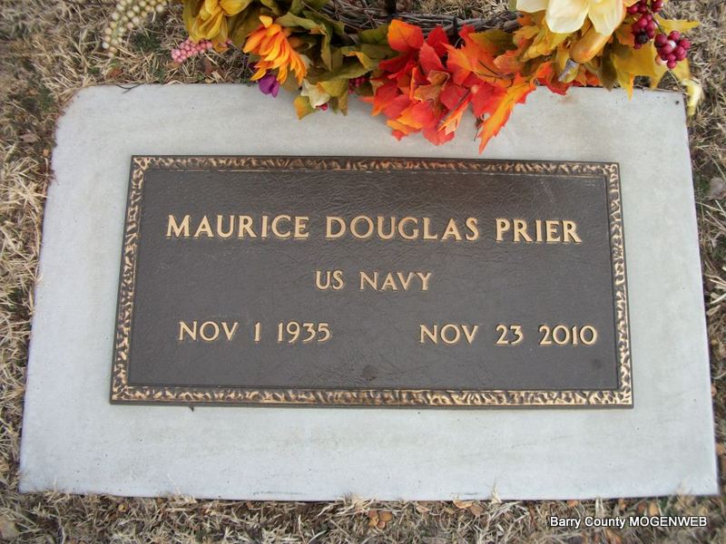 Inscription: "US NAVY" - Research Note: Chief Petty Officer Maurice Prier formerly of Purdy, Barry Co., MO was the son of Oscar C. Prier and Rilla (Andrews) Prier. After enlisting in the United States Navy in 1954, Maurice had an outstanding 20-year military career as an aviation electrician and also received many medals in which his family is very proud. Maurice was a man of integrity and ability, and upon his honorable discharge in 1974, he joined MFA, transporting propane gas. In addition to his parents, he was preceded in death by one brother, Virgil E. Prier, and two sisters, Lucille Turner and Rowena Higgs. | White Funeral Home Phyllis Long Photo Diana Cope |
