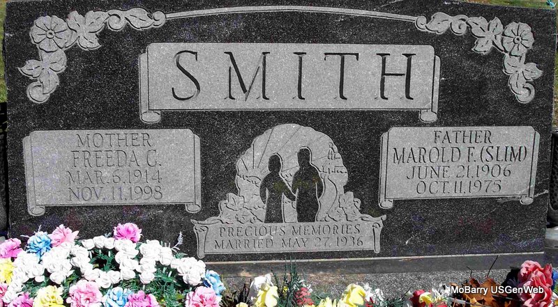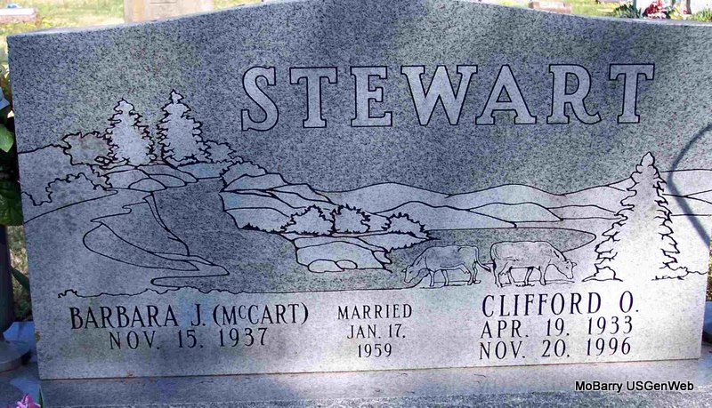 SSW: Clifford O. - Inscription: "Married Jan. 17, 1959" - Research Note: She was the daughter of Floyd Ruby McCart and Marion M. Freese. On January 17, 1959 in Springfield she was united in marriage to Clifford O. "Cliff" Stewart, who preceded her in death on November 20, 1996. Also preceding her in death were her parents and one brother, Larry McCart. Barbara grew up and received her education in Elkland, Missouri and was a 1956 graduate of Elkland High School. For several years she and her husband resided in several areas while Cliff worked for NOAA's National Weather Service. In 1970 they moved from Columbia, Missouri to Cassville, where she was a dairy farmer. She was a member of Calvary Baptist Church, charter member of Southwest Missouri Dairy Goat Association, a member of Registered Jersey Association, lifetime 4-H leader earning 4-H Hall of Fame Honor and worked with livestock shows as coordinator and judge. - Back of Stone | Barbara Stewart McQueen Funeral Home Phyllis Long Photo Diana Cope |