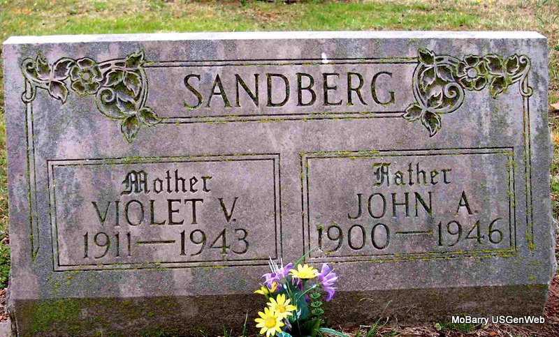 SSW: Violet V. - Research Note: Death certificate has birth year 1898. He was widowed twice and usual address was Cassville, Barry Co., MO. He was a farmer and carpenter and the son of Axele Sandberg born Sweden and Emma Killim born ND. R. G. Jinks of Cassville, MO was the informant. Cancer of the stomach was the cause of death. | Death Certificate Phyllis Long Photo Diana Cope |