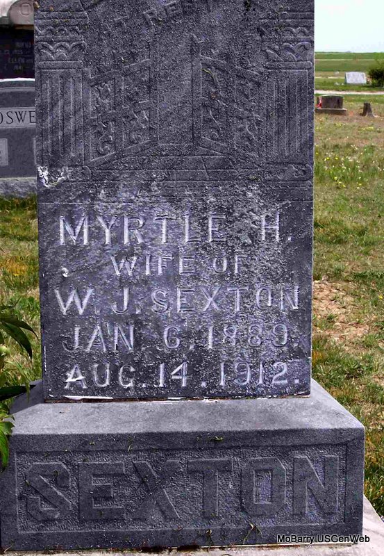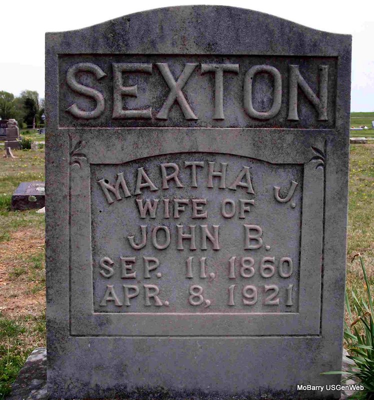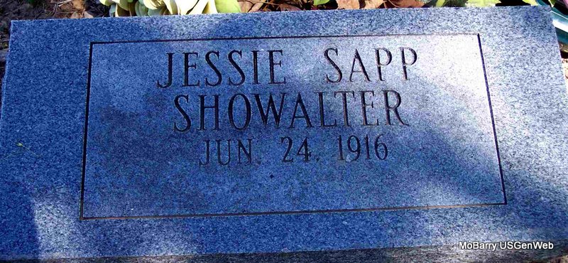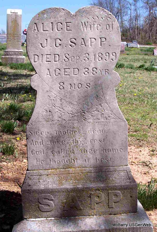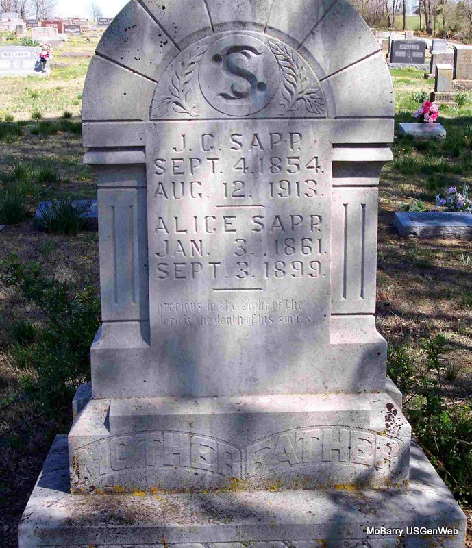 SSW: Alice - Research Note: Also inscribed on the headstone is "Alice Sapp - Jan 3, 1861 - Sep 3, 1899 - Precious in the sight of the Lord is the death of his Saints" - He was widowed and the son of Silas M. Sapp and Elizabeth Swiger, both born WV. James M. Sapp of Exeter, MO was the informant on the death certificate. | Death Certificate Phyllis Long Headstone Mary Lou Adams Photo Diana Cope |