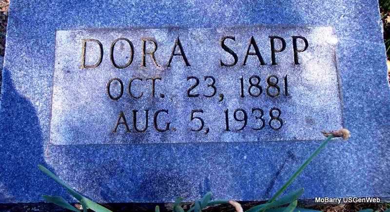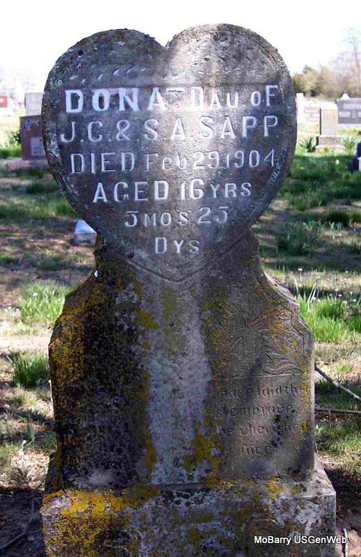 | SAPP, Dona | Sept. 4, 1887 | Feb. 29, 1904 | Inscription: "Dau. of J. C. and S. A. Sapp - died Feb. 29, 1904 aged 16 yrs, 5 mos, 25 days" - Research Note: Cassville Republican, March 5, 1904 - Miss Dona Sapp, aged 16 years, was buried Tuesday at Mt. Pleasant Church. She had died of consumption and was a daughter of Carl Sapp. - Note: Mother was Alice Elam. | Online Obit Phyllis Long Headstone Mary Lou Adams Photo Diana Cope |