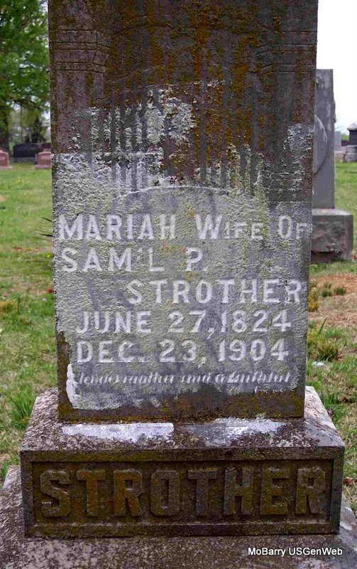 Inscription: "Wife of Sam'l P." - Research Note: She was the daughter of William R. Sooter and Anna Fly. She first married John R. Howerton on Aug. 10, 1842 in Barry Co., MO. Her second husband was Samuel P. Strother, married on Aug. 28, 1852 in Barry Co., MO. Samuel was the son of French and Elizabeth Strother. He was a Civil War Veteran on the Confederate side. He was captured and died at a Federal Prison in Pine Bluff, AR. - 1860 Census, Shoal Creek, Barry, Missouri - Samuel P. Strother age 37, born MO; Mariah, age 35, born TN; Julia A. (Howerton), age 16, born MO; William J. (Howerton), age 13, born MO; Elizabeth Sarah (Howerton), age 9, born MO; James Walter, age 7, born MO; Edward Marion, age 4, born MO; John French, age 3; Madison Monroe, age 1, born MO. - One more child, Susan Mildred, was born abt. 1861. | Census MO Marriage Records Ancestry.com FGS Phyllis Long Photo Diana Cope |