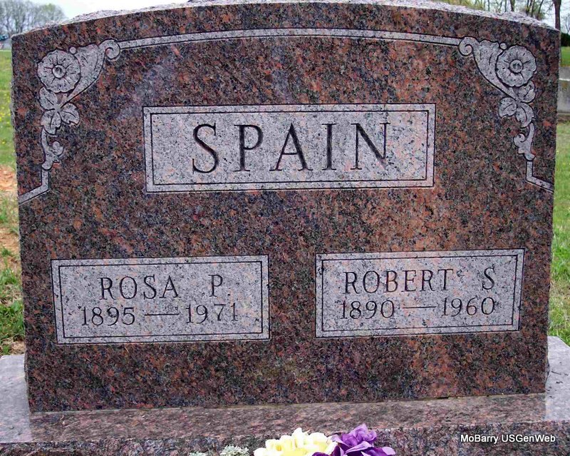 SSW: Rosa P. - Research Note: He was the son of Robert Sidney Spain Sr. and Emma Burt/Burton. His wife was Rose Edwards. Informant on the death certificate was Artie Spain of Purdy, MO. - Cassville Republican, Thursday, August 29, 1918 - Robert Spain and family visited his sister, Mrs. Arch Graves, and family. | Death Certificate Online Newspapers Phyllis Long Photo Diana Cope |