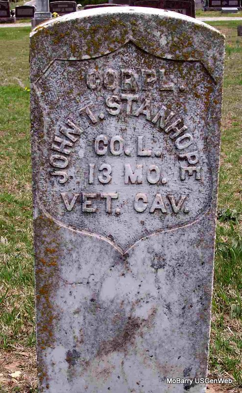 Inscription: "CORPL CO L 13 MO VET. CAV" - Research Note: He was a married saddler, he died of chronic nephritis and asthma. Father listed as Geo. Stanhope, born in England. No mother listed. Informant listed as Pearle/Paralee Stanhope of Exeter, MO. - He was the son of George Washington Stanhope and Lucy Elizabeth Durrands. He first married Mary D. Davis and second Paralee Martha Bryant. J. T. Stanhope, age 52 from Boone Co., AR, married Paralee Bryant, age 27 from Harrison, Boone Co., AR, on Aug. 26, 1899 in Boone Co., AR. He was a Civil War Veteran, enlisted in Co. C, MO 11th Cavalry Regiment as a Private. | Census AR Marriage Index Phyllis Long Death Certificate Donna Cooper Photo Diana Cope |