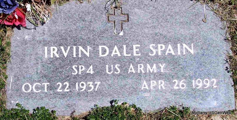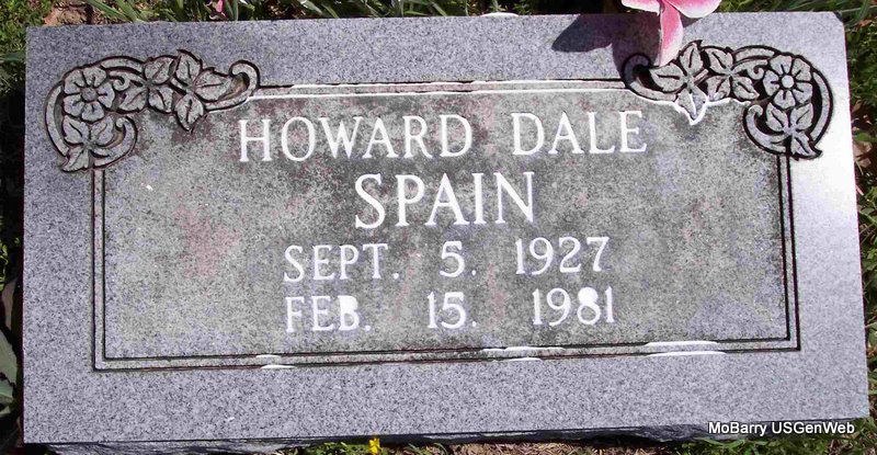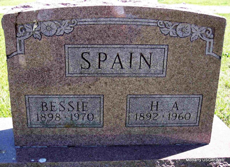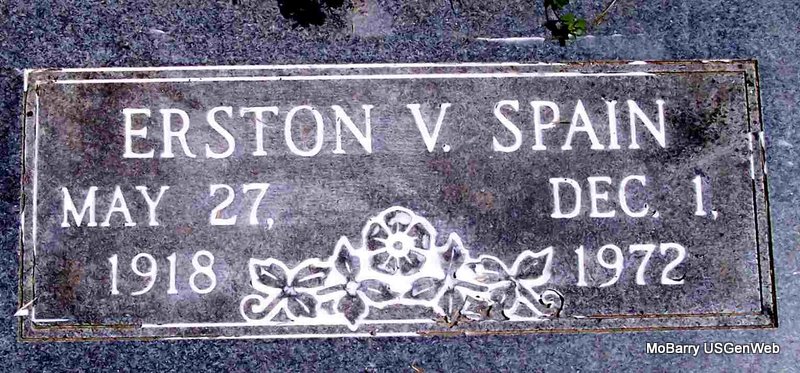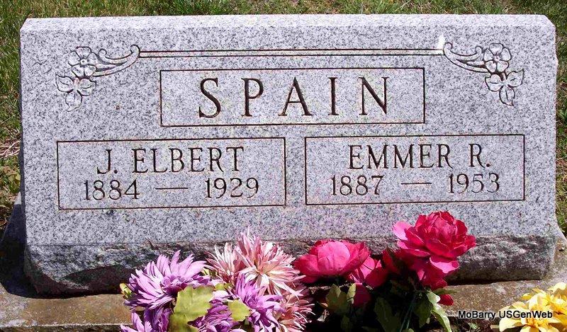 SSW: Emmer R. - Research Note: Death certificate gives 1883 for the birth year. Stone has 1884 for the birth year. His death was caused from an accident. He fell, hitting his head on an iron bar. His father was given as Robert Spain, and his mother as Emma Burk. Mrs. James E. Spain of Cassville, MO, gave the information. - He was the son of Robert Sydney Spain and Emiline (Emma) Pearlie Burk. | Death Certificate Donna Cooper Photo Diana Cope |