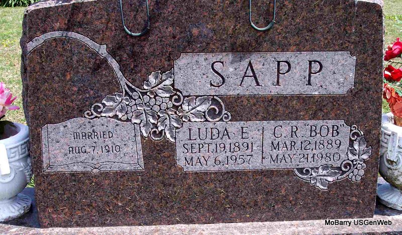 SSW: Luda E. - Inscription: "Married Aug. 7, 1910" - Donna Cooper's Research Note: He was a son of Thomas Newton and Lucinda Amanda (Elam) Sapp. - Sapp Family Photo | Headstone Mary Lou Adams Note Donna Cooper Photo Diana Cope |