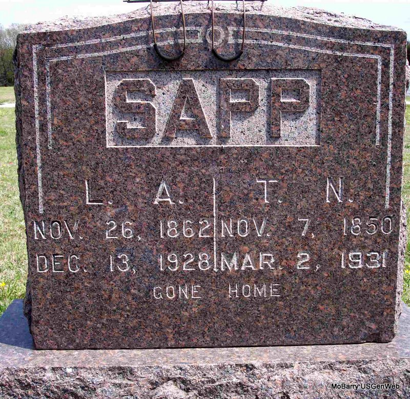 SSW: Thomas Newton - Inscription: "Gone Home" - Research Note: Parents of James M., Sanford N., Clarence Raymond, Flossie, Elizabeth, and Ina. Donna's note: Lucinda was a daughter of James Henry and Louisa Marnitha Paralee (Rogers) Elam. She was a sister of Richard H. Elam who was married to Alice Haddock, daughter of Boone Haddock. - Cassville Republican, Dec. 20, 1928 - Mrs. Lucinda Amanda Elam-Sapp, wife of T. N. Sapp, died at their home north of Exeter, Friday Dec. 14 at the age of 66 years, 11 months and 14 days after a short illness. She was born in Greene County, MO, on Nov. 26, 1862 and when a small child moved with her parents to Seneca, where they died. After their death she made her home with different relatives until about the age of seventeen when she went to make her home with Mr. and Mrs. Washington Montgomery. She was married to T. N. Sapp on Feb. 9, 1882 and to this union were born seven children, six of whom are living. They are James, Sanford, Clarence, Mrs. Flossie Linebarger, Mrs. Lizzie Yarnall and Mrs. Ina Bayless, all living in this county. Her first born, Ona Pearl, died when about six months of age. She leaves beside her husband, Uncle Newt and children, thirty grandchildren, four grandchildren having preceded her in death, also one brother, R. H. (Dick) Elam of Eagle Rock and one half brother, John Elam of Bartlesville, Okla., a host of relative and friends. - Death Certificate says she was born in Carroll Co., AR. Father born Greene Co., IL. Mother not listed. T. N. Sapp was the informant. | Note Donna Cooper Online Obit Death Certificate Phyllis Long Headstone Mary Lou Adams Photo Diana Cope |