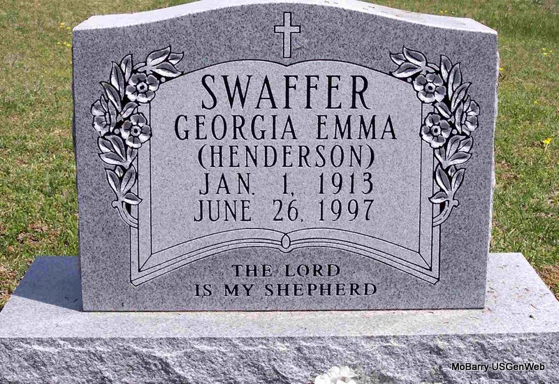 Inscription: "The Lord is My Shepherd" - Research Note: She was the daughter of Edmund P. and Lillie Henderson. Online records say she was the wife of Samuel Jefferson Swaffar. He died in 1985 and is buried at Arnhart Cemetery, Barry Co., MO. | Census Phyllis Long Photo Diana Cope |