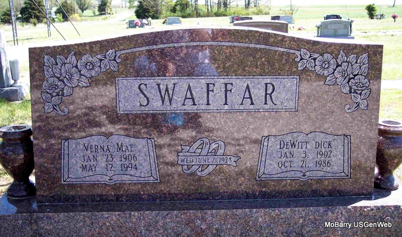 | SWAFFAR, DeWitt "Dick" | Jan. 3, 1902 | Oct. 21, 1986 | SSW: Verna Mae - Inscription: "June 21, 1928" - Research Note: His given name was Porter DeWitt. He was the son of Thomas Jefferson Swaffer and Adelia Gilespie Liner. | Census Phyllis Long Photo Diana Cope |