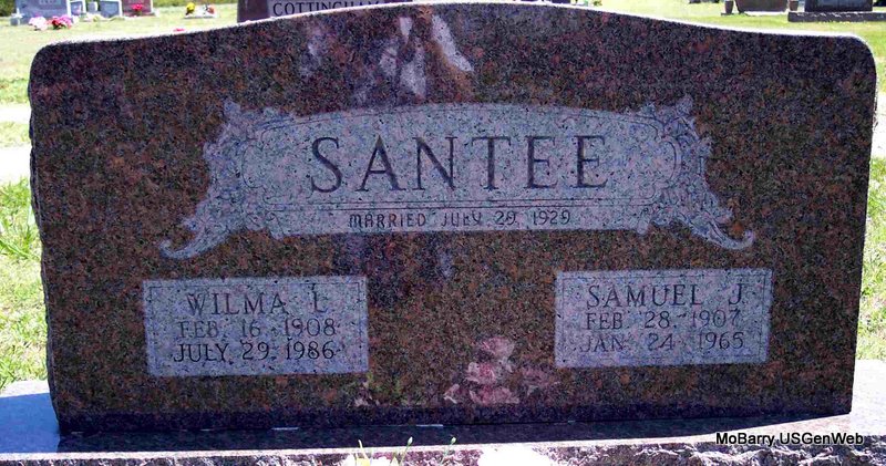 SSW: Wilma L. - Inscription: "Married July 29, 1929" - Research Note: He was the son of John Santee and Viola Leona Patton. His wife Wilma was the informant on the death certificate. - Wheaton Journal, August 8, 1929 - Miss Wilma Vaught and Samuel J. Santee were united in marriage by Rev. Ollie Ennis at his home near Monett Wednesday afternoon July 31. The bride is the daughter of M. C. Vaught, who lives near Corsicana. She is a graduate of Wheaton High School, has attended Bolivar College two summer terms and has taught three successful terms at Corsicana, her home district. She has been employed to teach the primary grade at Ridgley the coming term. Sam Santee is a son of Mrs. Ollie Santee of Shoal Creek. Their many friends wish them a happy and prosperous future. | Census Online Newspapers Death Certificate Phyllis Long Photo Diana Cope |