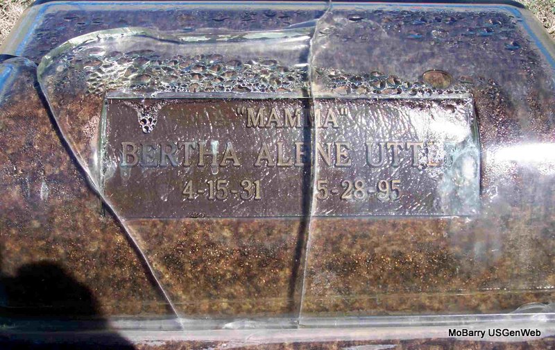 Inscription: "Mamma" - Research Note: Daughter of John Glen Vanderpool and Inez Mildred Beaver. SS Claims Index: June 1966: Name listed as BERTHA ALENE COOPER; May 29, 1975: Name listed as BERTHA ALENE UTTER; June 6, 1995: Name listed as BERTHA A. UTTER. | SS Claims Index Phyllis Long Headstone Cheryl Photo Diana Cope |
