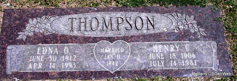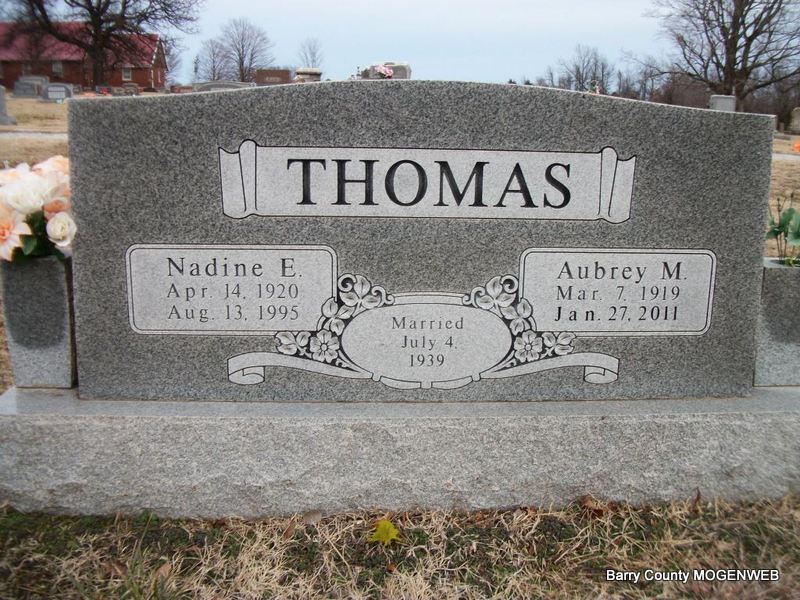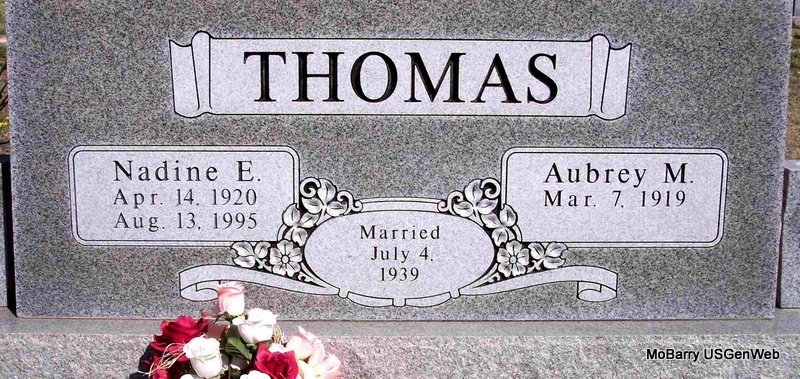 SSW: Nadine E. - Inscription: "Married July 4, 1939" - Research Note: He was the son of Daniel Webster and Rita (Inman) Thomas. He united in marriage to Nadine McCracken on July 4, 1939 in Purdy, MO. She preceded him in death August 13, 1995. Mr. Thomas served in the Army during WWII. He retired from Brown Construction in K.C., MO and also as a painter in the Monett and Purdy area. Aubrey was preceded in death by his parents and wife, along with one son Teddy Thomas in 1945, two brothers Dale Thomas and Layton Thomas and one sister Vera Terry. - Another Photo | Bennett-Wormington Funeral Home Phyllis Long Photos Diana Cope |