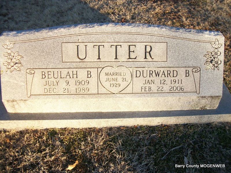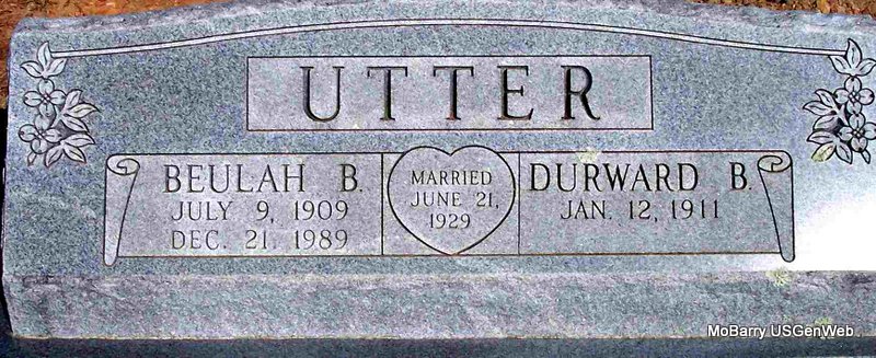 SSW: Beulah B. - Inscription: "Married June 21, 1929" - Research Note: He was a son of Leander Scott and Mary Emiline (Witt) Utter. He married Beulah B. Douthitt, and she preceded him in death. He was a retired truck driver. He was preceded in death by his parents; his wife; two brothers; and nine sisters. - Another Photo | Cassville Democrat Phyllis Long Headstone Cheryl Photos Diana Cope |