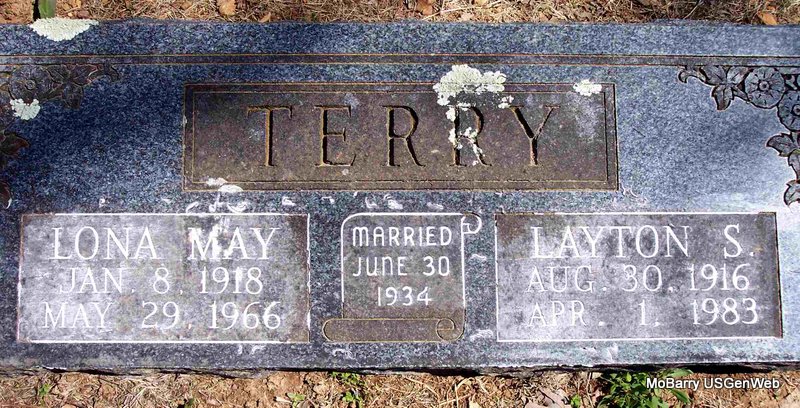 | TERRY, Layton S. | Aug. 30, 1916 | Apr. 1, 1983 | SSW: Lona May - Inscription: "Married June 30, 1934" - Research Note: Son of Alford Monroe Terry and Martha Elmira Terry. | Census Phyllis Long Photo Diana Cope |