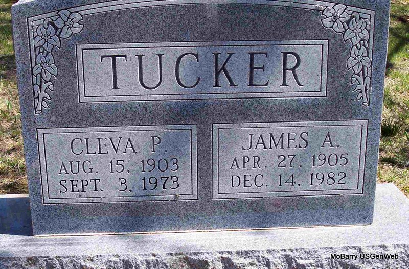 SSW: Cleva P. - Research Note: Services for J. A. Tucker, 77, Cassville, who died at 10:30 pm, Tuesday, December 14, 1982, at St. John's Hospital, Springfield, where he had been a patient two weeks, were at 2 pm Saturday, at Williamson Chapel, Cassville. Burial was in Mount Pleasant Cemetery, north of Butterfield. Mr. Tucker was born April 27, 1905, near Exeter and had lived in Cassville since 1936. Son of James Elmer Tucker and Lena Davidson. He was a retired special equipment operator for the Frisco Railroad and a member of the Mount Pleasant Methodist Church. He married Irene (Webb) Ragland on January 26, 1974, in Cassville. His first wife Cleva (Harper) Tucker preceded him in death. Other survivors include two daughters, three sons, two step sons, four step daughters, his mother, three brothers, two sisters, 13 grandchildren, 14 great-grandchildren, 12 step grandchildren and 8 step great-grandchildren. | Obit Census Phyllis Long Headstone Cheryl Photo Diana Cope |