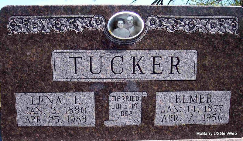 SSW: Lena E. Tucker - Inscription: "Married June 19, 1898" - Research Note: He was the son of Thomas Tucker and Frances Goostree. His wife was the informant on the death certificate. - James Elmer Tucker, 79, lifelong resident of the Doss community west of Butterfield, passed away at the Cassville Community Hospital at 8:30 Saturday morning, April 7, after a sickness of sometime. He had been in the hospital for seven days. Mr. Tucker was a son of the late Thomas Benjamin and Mary Frances (Francis Elizabeth Goostree) Tucker and was born January 14, 1877, to attain the age of 79 years, two months, 24 days, and spent his entire life on the farm where he was born. He was one of the county's most highly esteemed citizens, to hold the respect and confidence of all who knew of the great life he lived. Mr. Tucker was married to Miss Lena Davidson of Exeter on June 19, 1898, and she survives. To the union were born four daughters, Mrs. Orme Reams, Mrs. Naomi Davidson, Mrs. Mary Higgs, and Mrs. Elsie Woodward, of Exeter. Four sons, Burl and James A Tucker, Cassville, Tom Tucker, Pasadena, Tx., and Johnny Tucker, Exeter, survive and two sons preceded him in death. Other survivors are 19 grandchildren; 20 great-grandchildren and many other relatives and friends. Three grandsons are serving in the armed forces. He was converted at the age of 19 years at the Mt. Pleasant Church and lived a devoted and consistent life through the year which was an example for those he held so near and dear. - Cassville Republican, Thursday, April 4, 1918 - Earl Mitchell sold Elmer Tucker northwest of Cassville a 1918 model Buick six car last week and J. G. Perkins of this city a Chevrolet. - Another Photo - Another Photo - Photo of James Elmer | Death Certificate Obit Online Newspapers Phyllis Long Headstone Cheryl Photo Diana Cope |