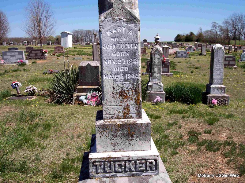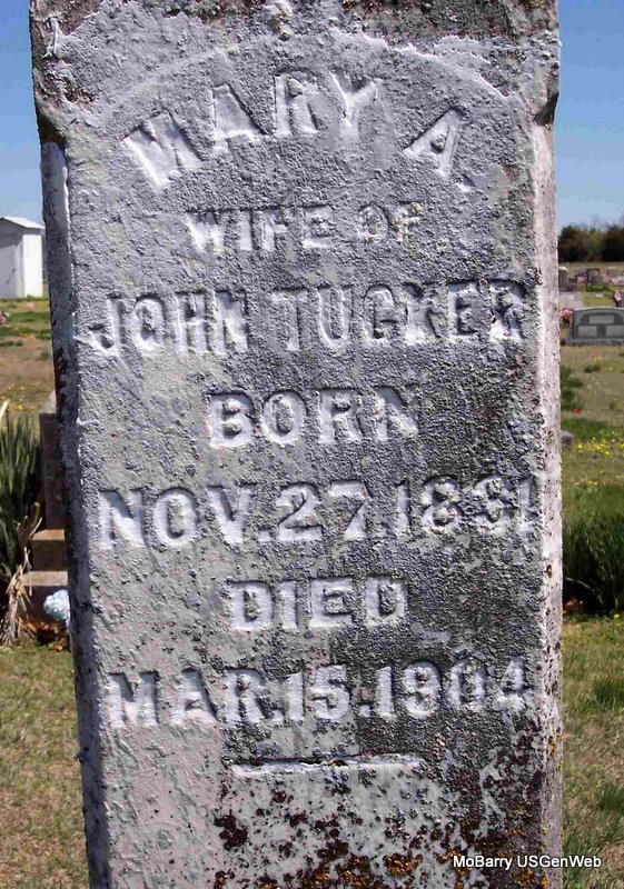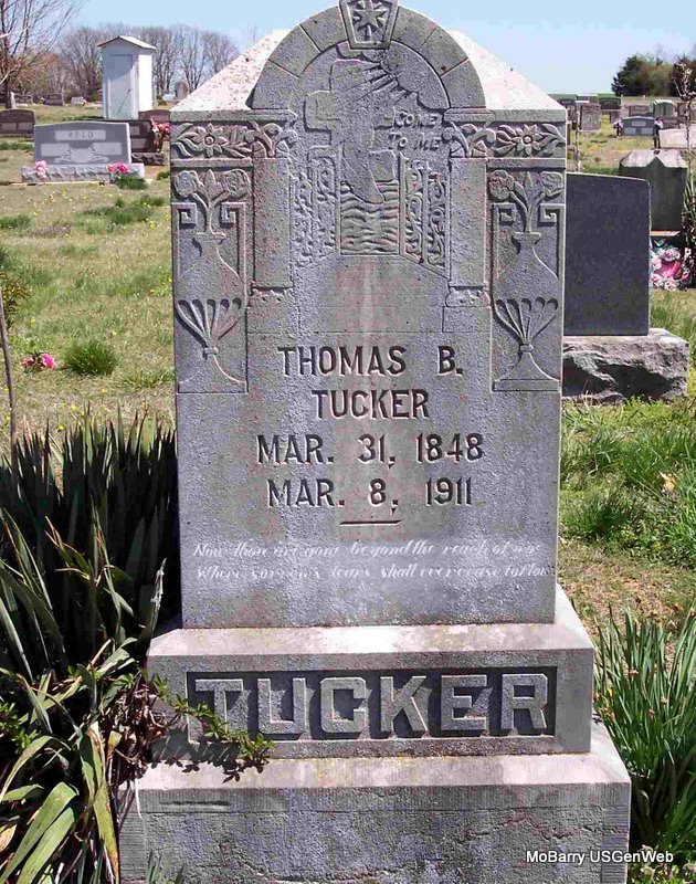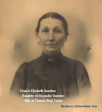 SSW: Frances Elizabeth - Research Note: He was widowed and a farmer. Son of John Tucker and Mary Stephens both born TN. J. E. Tucker of Exeter, MO was the informant on the death certificate. - Cassville Democrat, Saturday March 11, 1911 - Thomas Tucker, aged 63 years, died Wednesday, at his home west of Butterfield, from pneumonia, after an illness of about a week. At the time of his death he was surrounded by all his relatives. In the death of Thomas Tucker, Barry County has lost an excellent citizen. He was a son of the late John Tucker. He is survived by a son Elmer Tucker and two brothers and one sister, Will Tucker of near Butterfield, John Tucker and Mrs. Mark Combs of near Purdy. He was born and reared in Barry County, and was highly respected by all. Several years ago he married Miss Frances Goostree, a member of that highly respected family. Mrs. Tucker died about two years ago. - Photo of Thomas | Death Certificate Online Newspapers Phyllis Long Headstone Cheryl Photo Diana Cope |