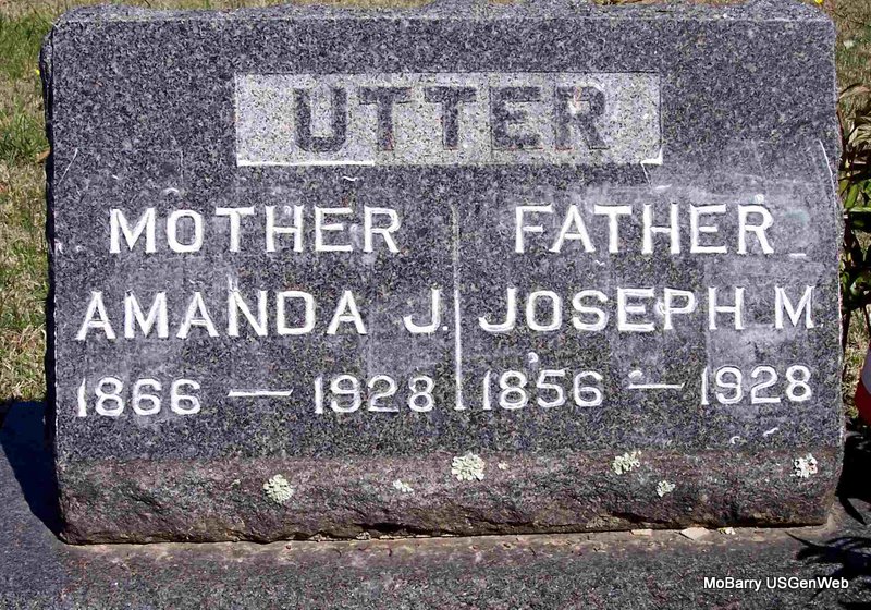 SSW:Joseph M. - Research Note: She was a daughter of Martin and Sarah M. (McCoy) Sooter. Joseph Utter of Purdy, MO was the informant on the death certificate. | Note Donna Cooper Headstone Cheryl Death Certificate Phyllis Long Photo Diana Cope |