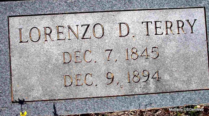 Research Note: The first posting had Sept. 9, 1894 as a death date, but the stone reads Dec. 9th. He was the son of Francis Martin Terry and Mary Ann Reed. Civil War Veteran: Lorenzo enlisted in the Union Army on Aug. 22, 1864 and was discharged on Mar. 6, 1865. He was a private in Co. A., 46th MO Infantry. He married Mary J. Haynes in Barry Co., MO on Aug. 4, 1870. | Census 1890 Veteran Census MO Marriage Records Phyllis Long Headstone Marion Elvin Haynes Photo Diana Cope |