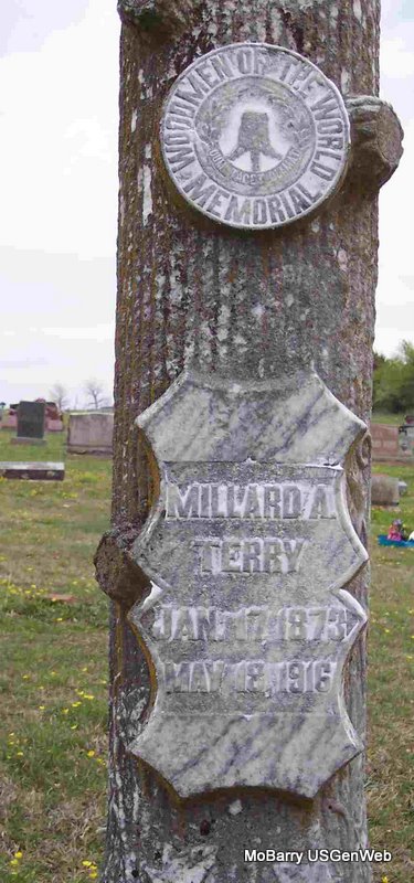Inscription: "Woodmen of the World" - Research Note: Cassville Republican, Weekly Paper, Oct. 24, 1901 - Licensed to Wed: Millard Terry, 28, Butterfield and Ollie Savage, 18, Butterfield. He was the son of Lorenzo Dow Terry, born Madison Co., AR, and Mary I. Haynes, born Gasconade Co., MO. - Cassville Republican, Thursday, May 23, 1918 - A large crowd attended the unveiling exercises given by the Butterfield Camp for the W. W. W. at the grave of M. A. Terry in the Mt. Pleasant cemetery northwest of Butterfield Sunday afternoon. The beautiful ritualistic ceremony of the order was carried out. The ceremony was in charge of Walter Ray. F. A. Freeze acting as Consul Commander. The addresses on the principles and work of the order was made by E. N. Meador. The music for the ceremony was in charge of Thos. Ferguson of Republic. | Census MO Marriage Records Online Newspapers Phyllis Long Headstone Marion Elvin Haynes Photo Diana Cope |