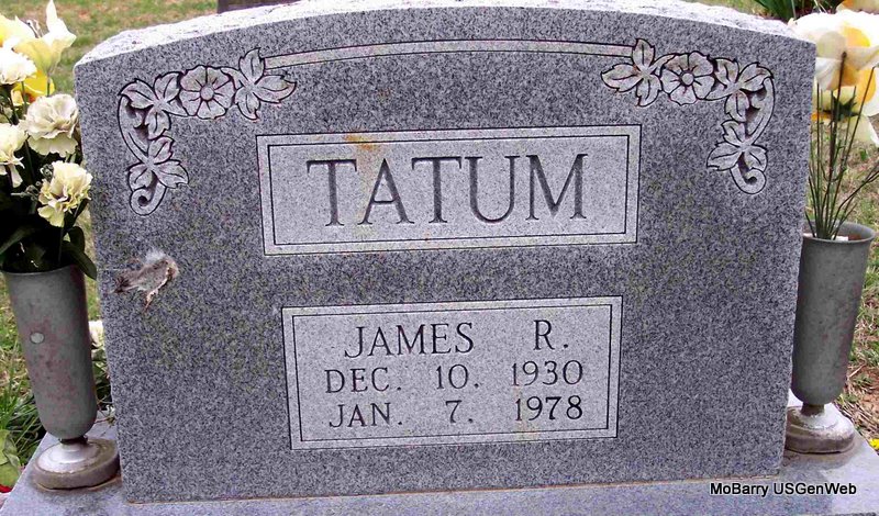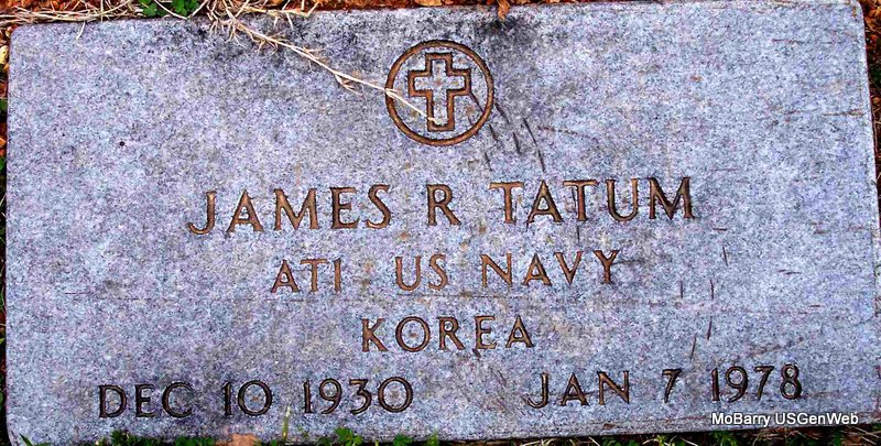 | TATUM, James Russell | Dec. 10, 1930 | Jan. 7, 1978 | Research Note: SSDI gives his last benefit sent to Cassville, Barry Co., MO. He was the son of Russell A. Tatum and Maude Elizabeth Gentry. - Military Stone - Inscription: "ATI US NAVY KOREA" | SSDI SS Claims Index Phyllis Long Photo Diana Cope |