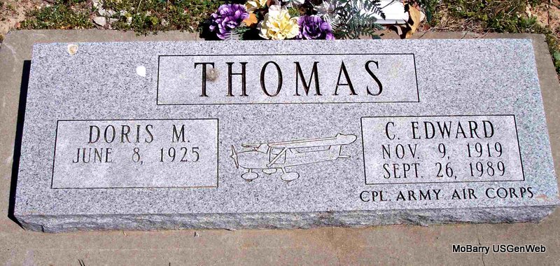 | THOMAS, Charles Edward | Nov. 9, 1919 | Sept. 26, 1989 | SSW: Doris M. - Inscription: "CPL ARMY AIR CORPS" - Research Note: Edward Thomas, age 36, married Doris Rasmussen on Mar. 3, 1956 in Stotts City, Lawrence Co., MO. He was the son of Chalmer Thomas and Elsie May Kinser. | Census MO Marriage Records Phyllis Long Photo Diana Cope |
