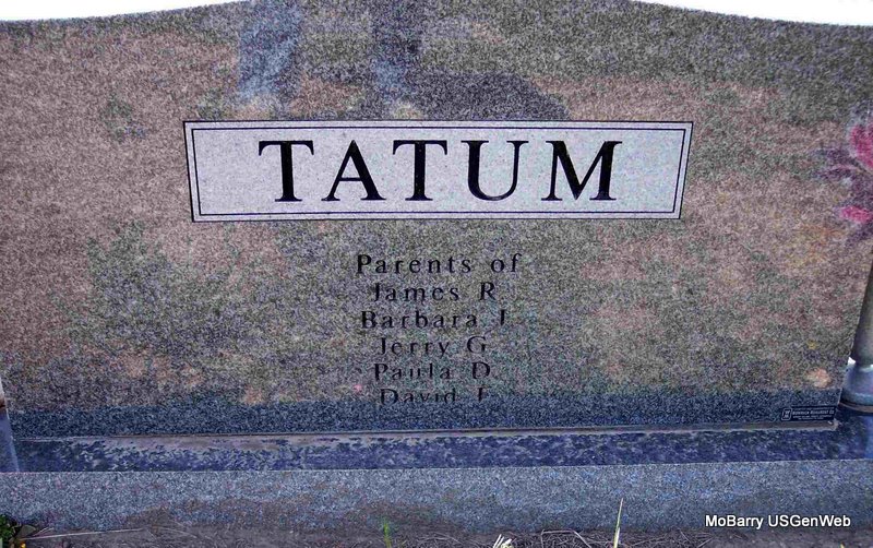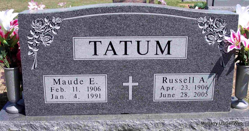 SSW: Maude E. - Research Note: Husband of Maude Elizabeth Gentry. Son of Robert and Sarah (Mathes) Tatum. Father of David, James, Jerry, Barbara and Paula. Mr. Tatum had been a strawberry grower in southwest Missouri. He served on the Butterfield School Board for 11 years, was vice president of the Butterfield Road District for seven years, and served six years as assessor of Barry County. When Butterfield lost its post office six years ago he was instrumental in getting petitions signed for the post office to re-open in that community. - Back of Stone | Friend of Family Photo Diana Cope |