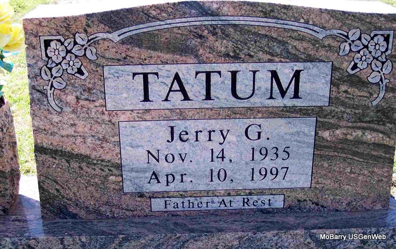 | TATUM, Jerry Gentry | Nov. 14, 1935 | Apr. 10, 1997 | Inscription: "Father at Rest" - Research Note: He was the son of Russell A. Tatum and Maude Elizabeth Gentry. | SS Claims Index Phyllis Long Photo Diana Cope |
